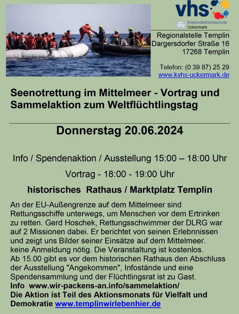 Weltflüchtlingstag mit Infostand, Finnissage der Ausstellung, Spendensamme-Aktion und Vortrag zu Seenotrettung